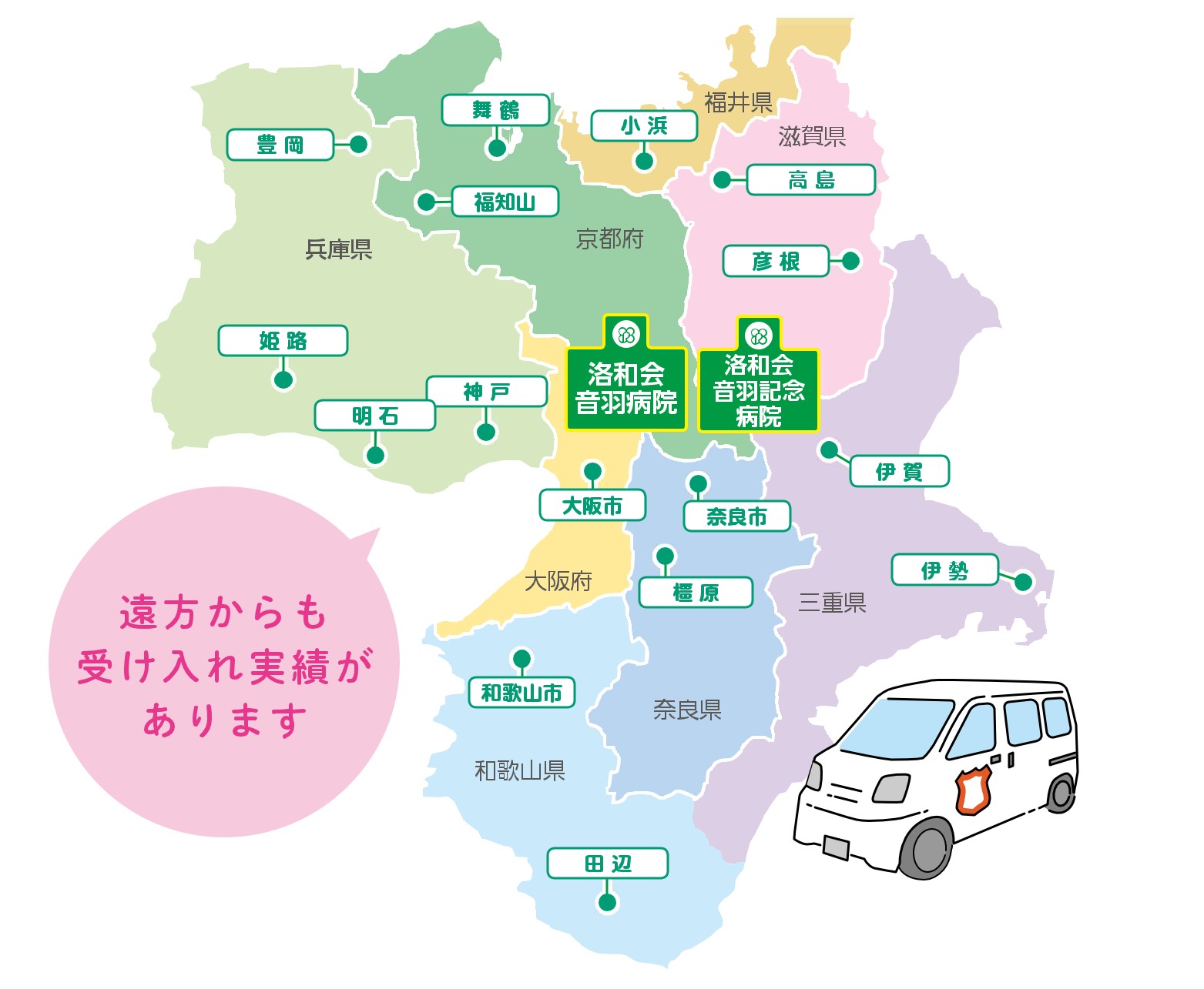 洛和会では2つの病院と2つのクリニックで透析治療を提供しており、4院が協力・連携しています。クリニックの患者さんに手術が必要な場合は、洛和会音羽病院や洛和会音羽記念病院で迅速に対応できるため安心です。また、通院や入退院時の負担を少しでも軽減できるよう、車いすやストレッチャーにも対応可能な車両を手配するなど、送迎支援サービスをご用意しています。