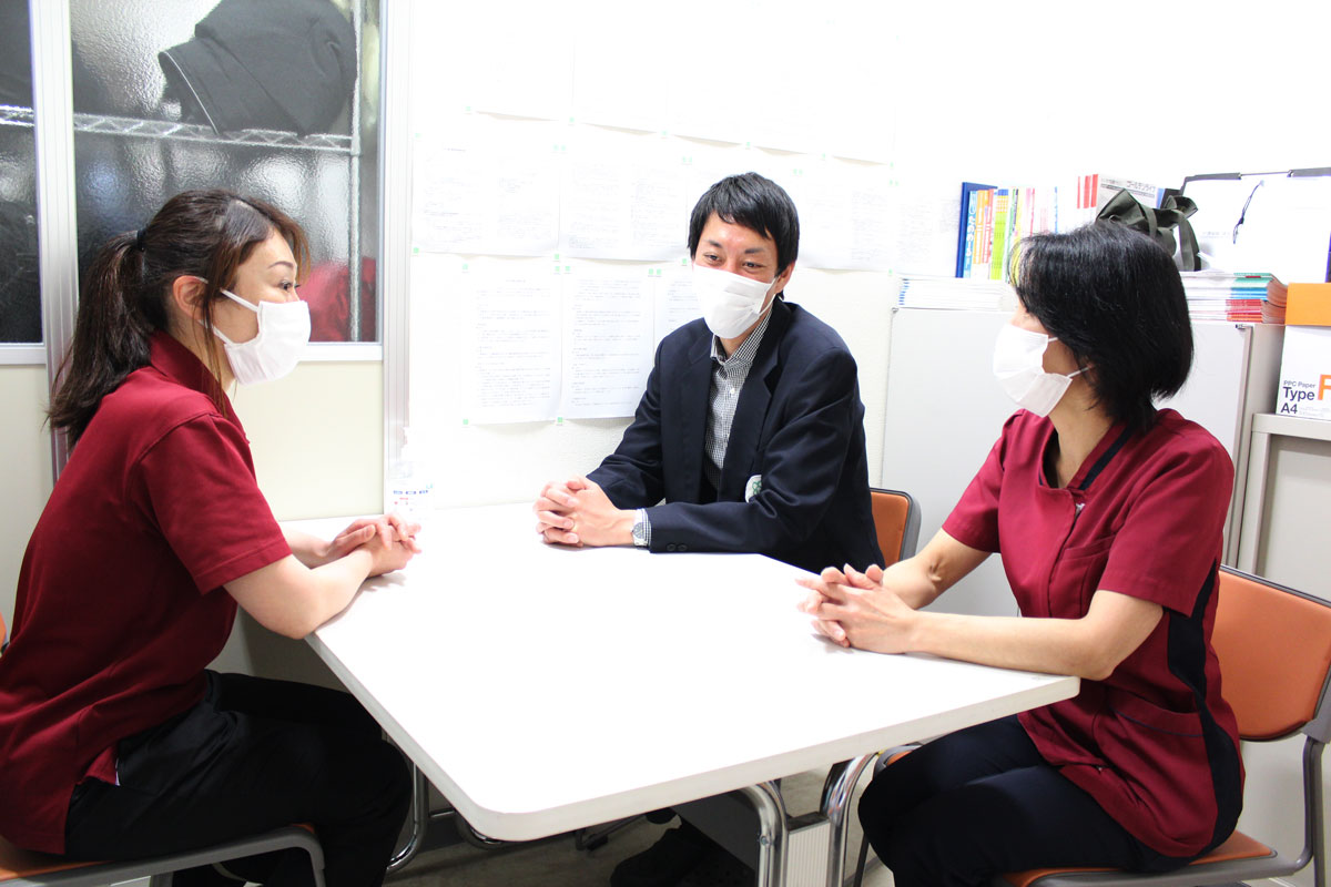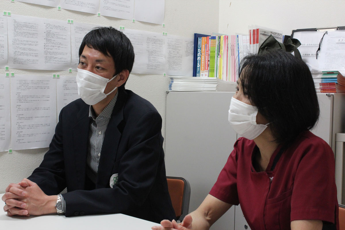 3つの事業所が同じ所にある一番のメリットはケアプランを考えるケアマネジャー(介護支援専門員)と実際にサービスを行う看護師やホームヘルパーが身近にいるので、情報共有が早いことです。コロナ禍で、サービス担当者会議の開催を自粛せざるを得ないこともある中、対面で話をできることも利点と考えています。