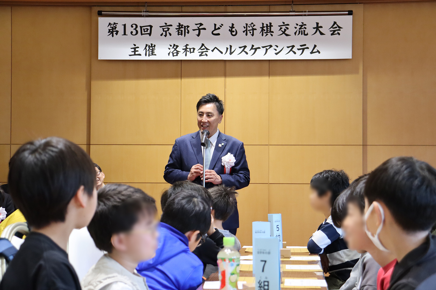 開会式で洛和会ヘルスケアシステム 理事長 矢野裕典は、「皆さんは児童館で毎日コツコツ将棋を打つ練習をして、予選を勝ち抜いてここにいます。一生懸命戦って、勝負が終わったらお互いを称え合ってほしいと思います。プロ棋士の方にもお越しいただいているので今日は、将棋の面白さを堪能してほしいです」と激励の言葉を送りました。