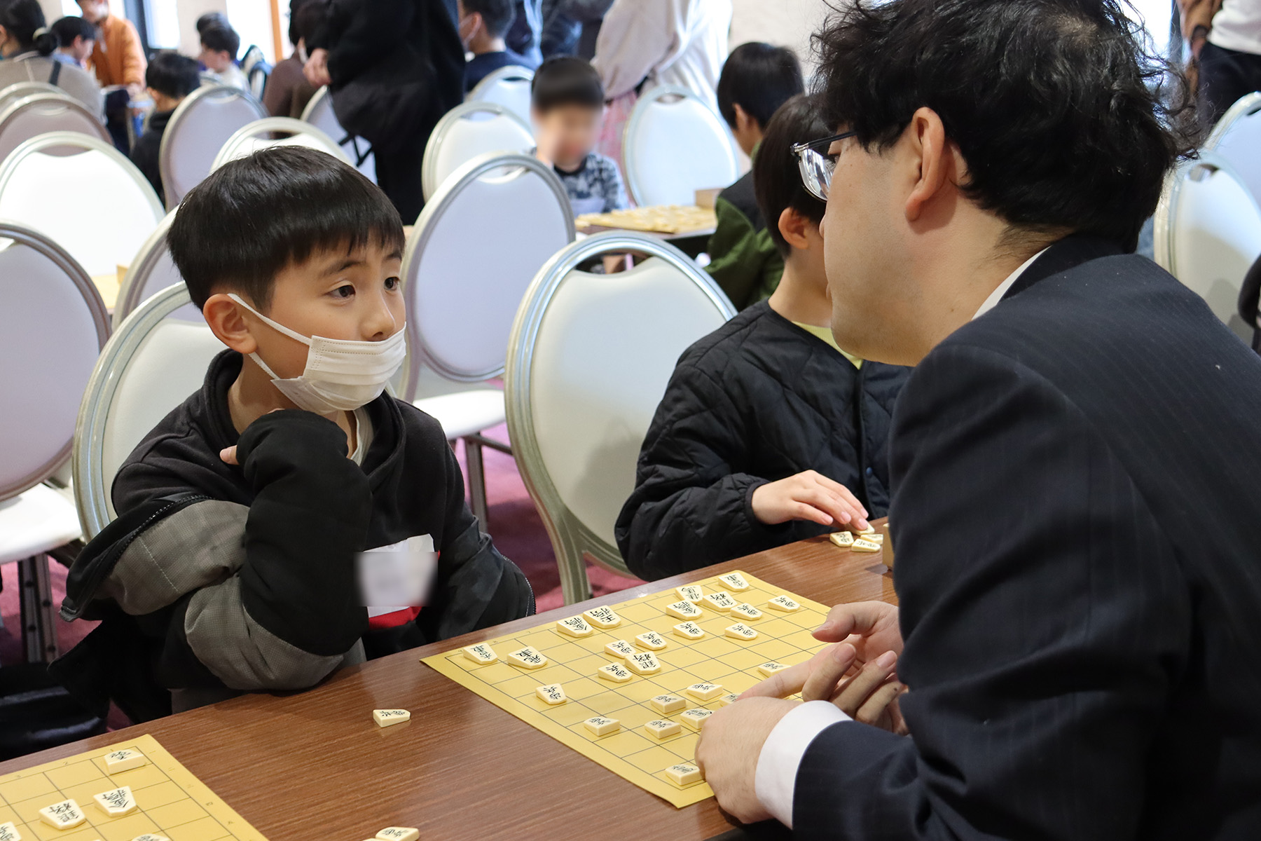 また、希望者にはプロ棋士の方との指導対局が実施され、子どもたちはプロ棋士の方のアドバイスを熱心に聞いていました。