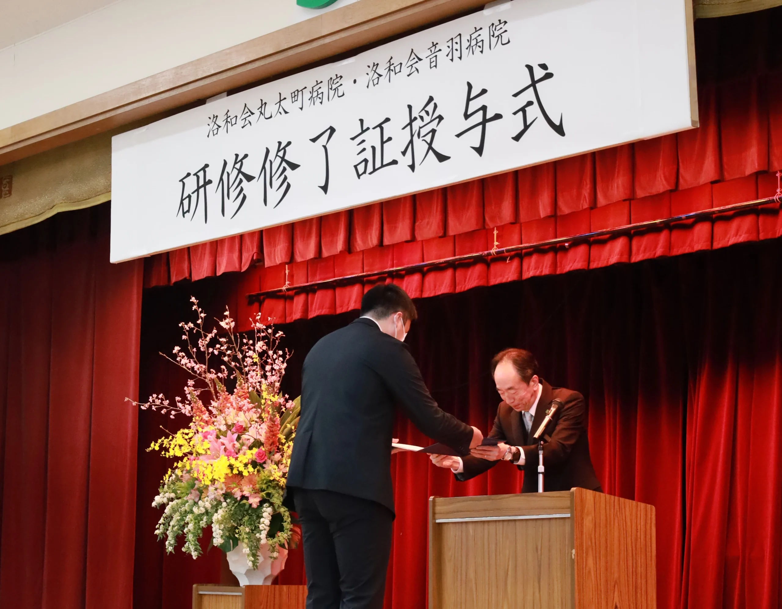 また、これからの時代はAIをはじめ社会の変化が一層速くなる中でも、患者さんや家族の立場に立って考える姿勢を忘れず、良い医療者として歩んでほしいとエールを送り、丸太町病院医科研修医代表の大竹諒さんに修了証を授与しました。