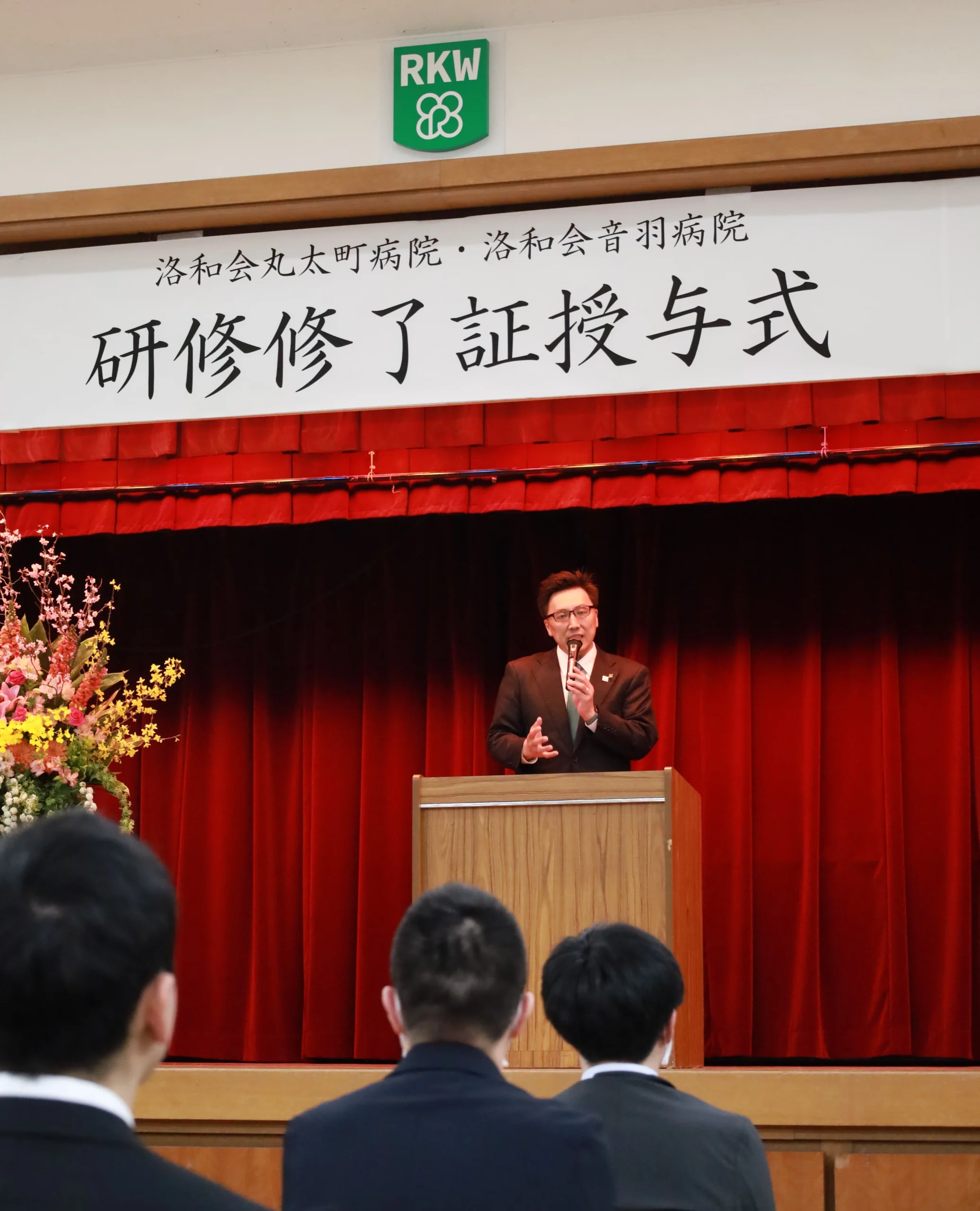 続いて洛和会音羽病院の黒田啓史院長は、専攻医8名、医科研修医8名、歯科研修医2名、特定行為研修看護師4名が新たな門出を迎えたことに触れ、それぞれが過ごした1年から3年の研修期間は非常に濃く、充実した時間であったはずだと述べました。